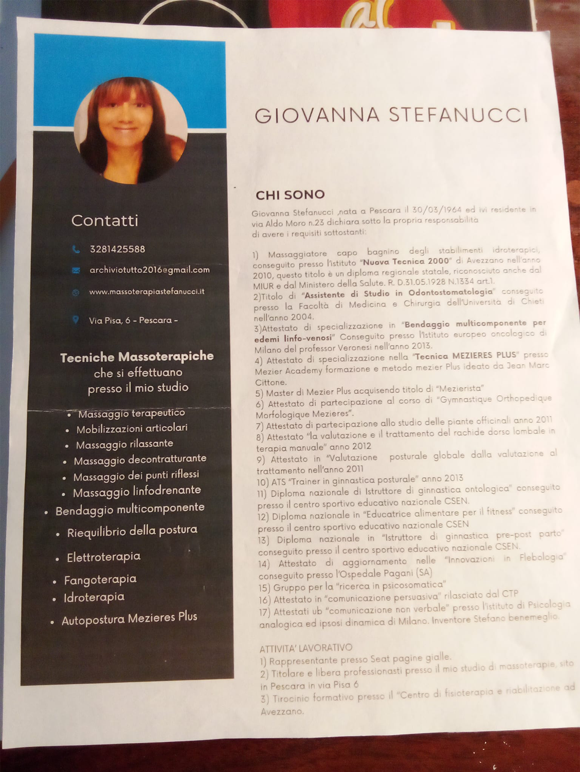 Giovanna Stefanucci esercita la propria professione presso lo “Studio di Massoterapia Riabilitativa” a Pescara.
